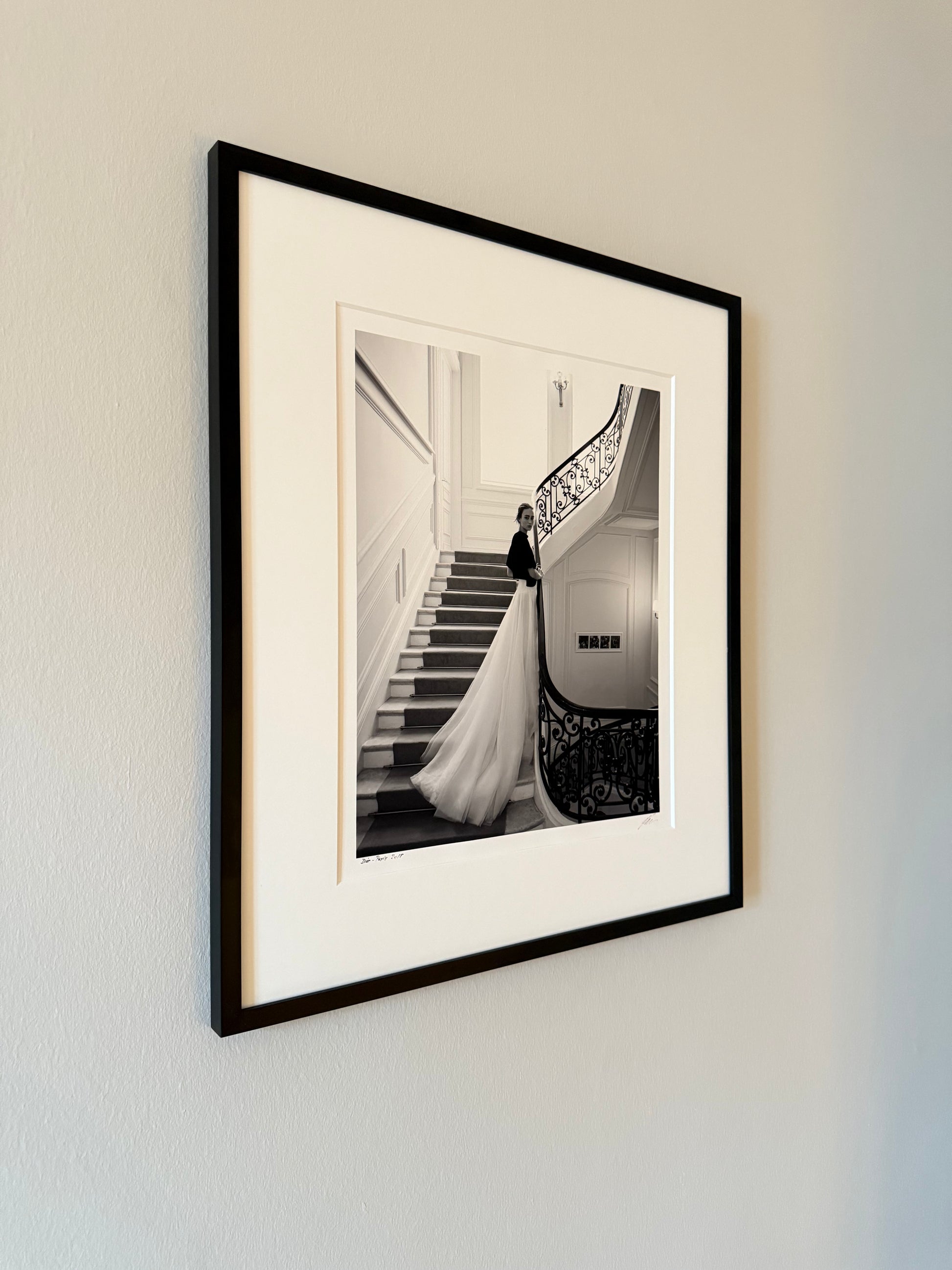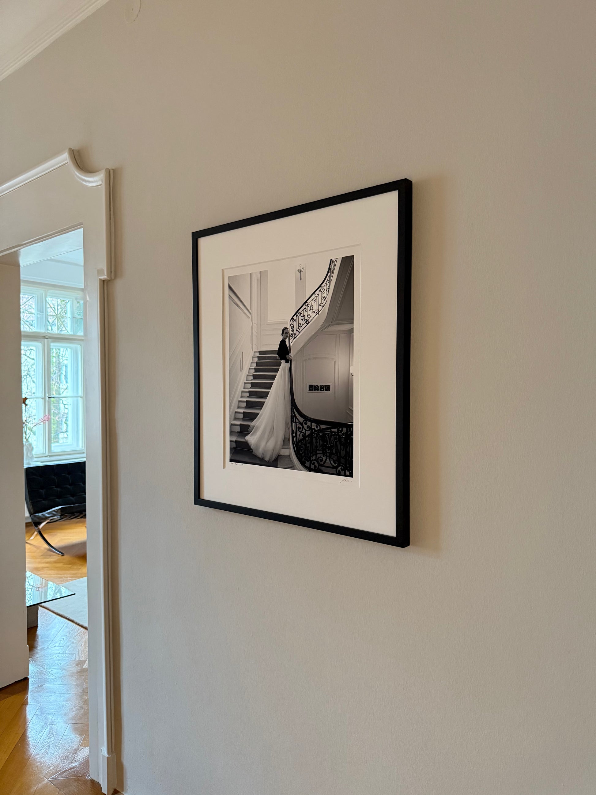 Gerahmt in Echtholz, wahlweise in matt schwarz (offenporig) oder matt weiß lackiert.