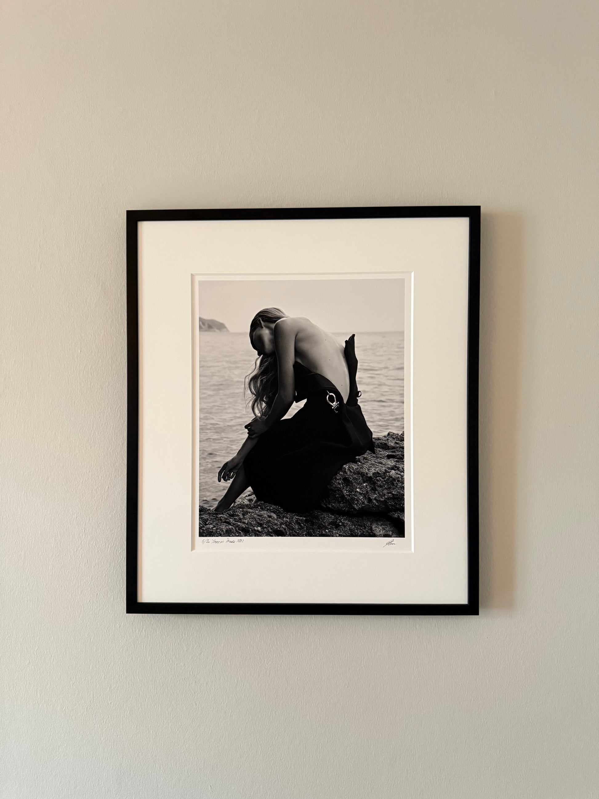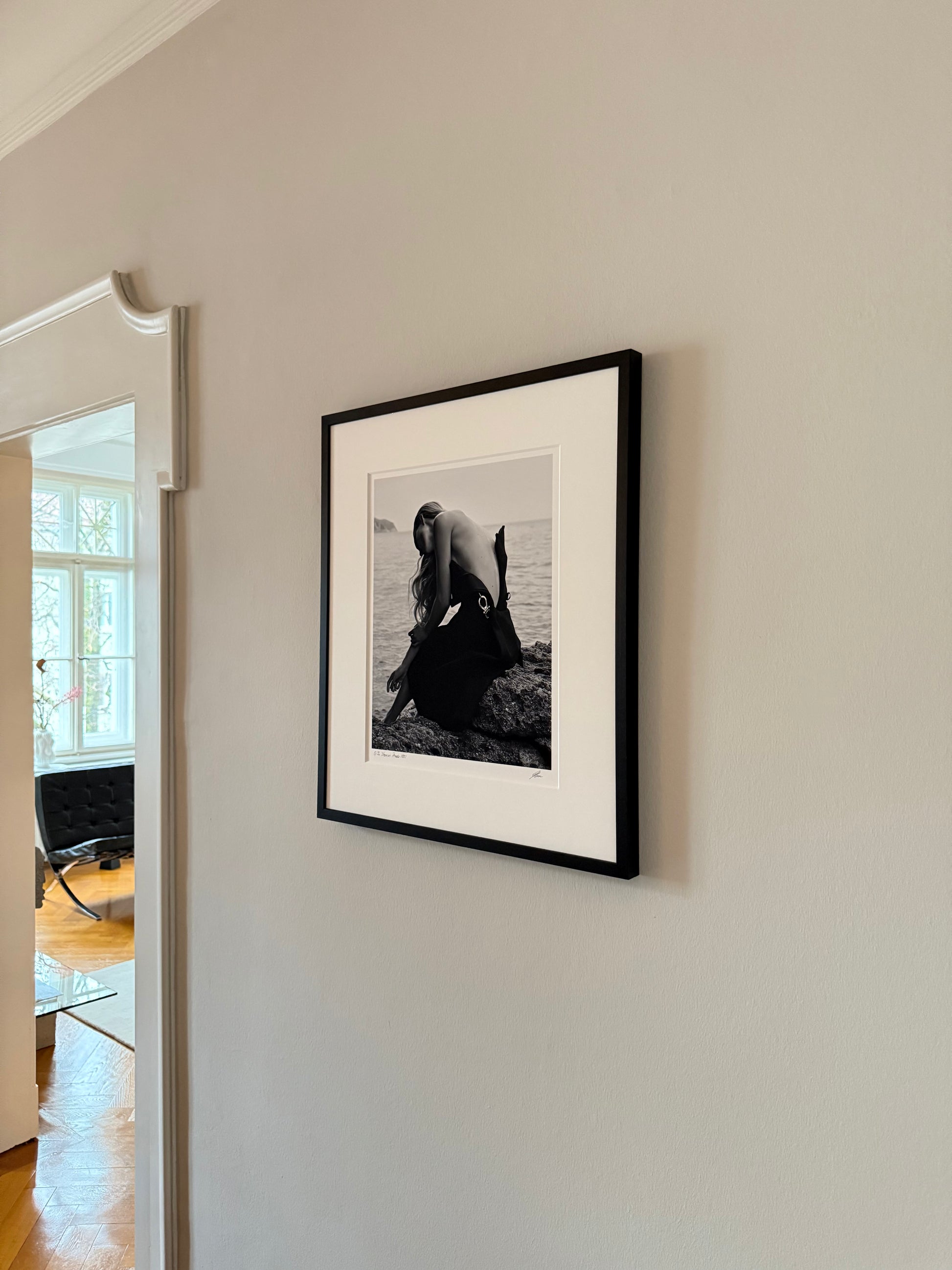 Gerahmt in Echtholz, wahlweise in matt schwarz (offenporig) oder matt weiß lackiert.
